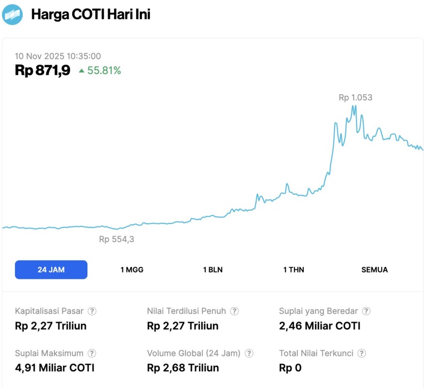 Pada 10 November 2025, harga COTI tercatat di Rp871,9, melonjak 55,81% dibandingkan hari sebelumnya. Lonjakan harga ini terlihat jelas pada grafik 24 jam terakhir, di mana COTI sempat menyentuh puncak harian di Rp1.053 sebelum mengalami koreksi ringan.