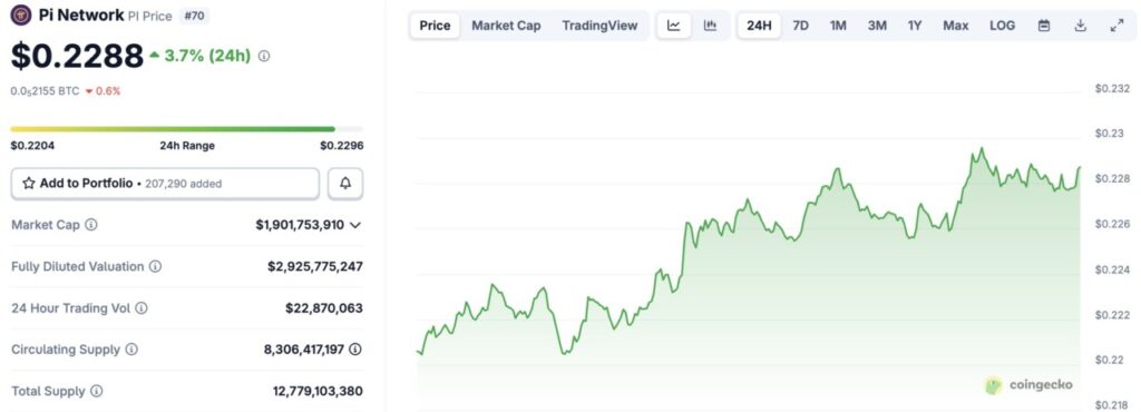 Dalam waktu 24 jam, harga PI bergerak dalam rentang $0,2204 hingga $0,2296, menunjukkan volatilitas moderat dalam sesi perdagangan harian. Kapitalisasi pasar mencapai $1,90 miliar, sementara valuasi penuh jika seluruh suplai beredar (fully diluted valuation) berada di $2,93 miliar.