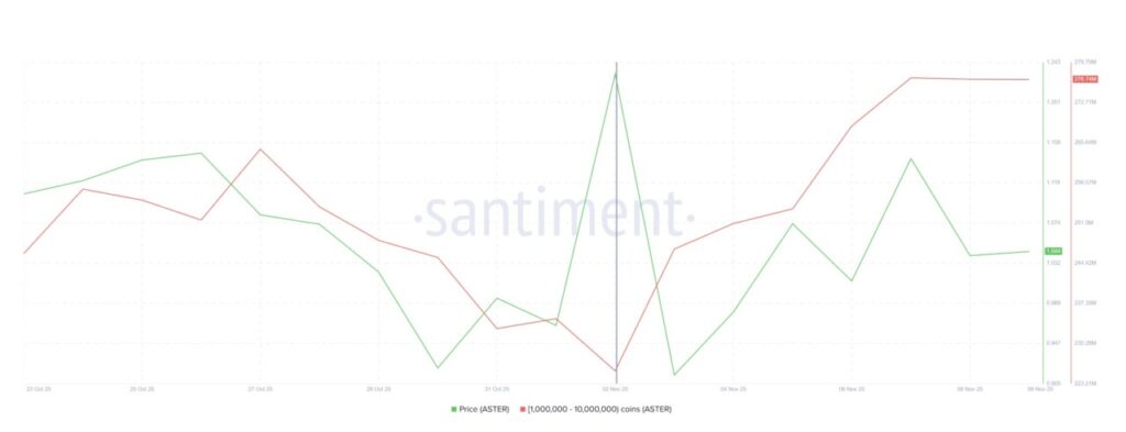 Data on-chain menunjukkan bahwa dompet dengan kepemilikan antara 1 juta hingga 10 juta ASTER telah menambah lebih dari 51 juta token sejak awal November, dengan nilai setara sekitar $53 juta.