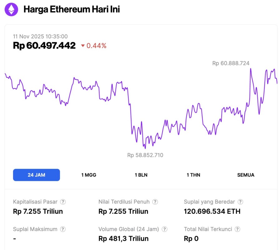 Pada 11 November 2025, harga Ethereum tercatat berada di sekitar $3,609 atau setara dengan Rp60.497.442 mengalami koreksi 0,44% dalam 24 jam terakhir. Sepanjang periode ini, ETH sempat menyentuh level terendahnya di Rp58.852.710, dan level tertingginya di Rp60.888.724.