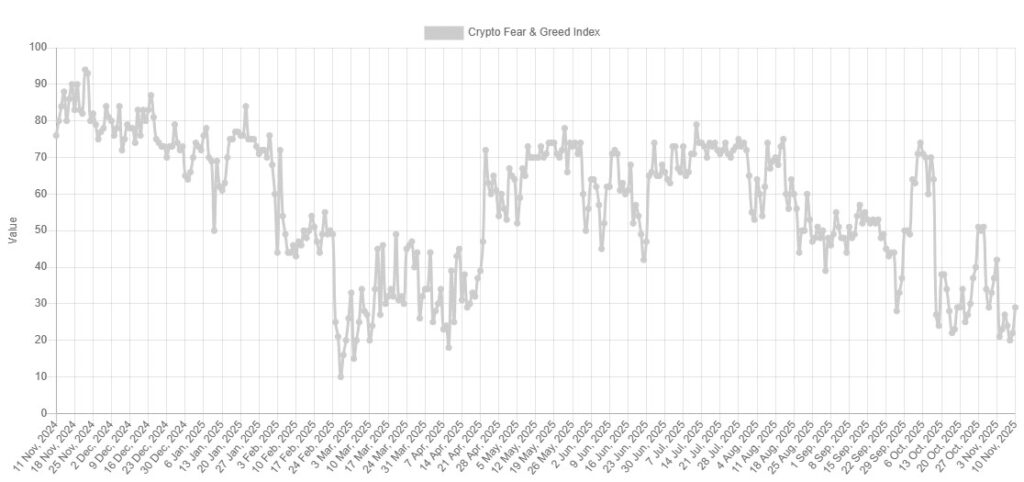 Fear and Greed Index Crypto pada 10 November berada di angka 29, dan sempat turun hingga 20 beberapa hari sebelumnya, angka yang terakhir kali terlihat pada pertengahan April. Pada awal 2025, Bitcoin (BTC) diperdagangkan dalam kisaran yang stabil, namun kehilangan kisaran tersebut pada bulan Maret, menyebabkan penurunan harga yang signifikan.