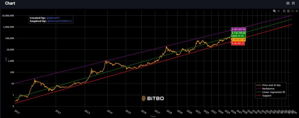 Model Hukum Kekuatan menunjukkan bahwa kenaikan terkini dalam siklus bull belum mencapai rally eksplosif yang biasanya menandai akhir dari siklus sebelumnya. Fase yang dikenal sebagai puncak blow-off, yang merupakan fase euforia pasar murni, belum terlihat. Mungkin kondisi kali ini berbeda, dan fase tersebut tidak akan terjadi.