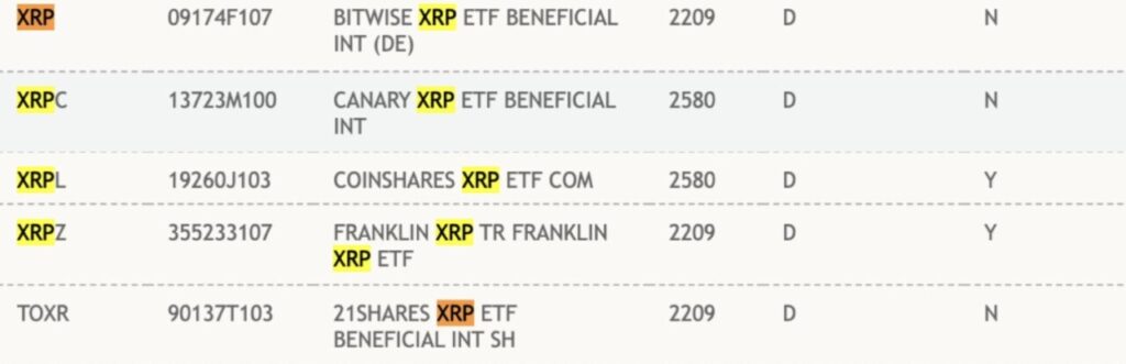Berdasarkan data dari Depository Trust and Clearing Corporation (DTCC), tercatat lima ETF XRP yang diajukan oleh Franklin Templeton, Bitwise, Canary Capital, 21Shares, dan CoinShares. Hal ini mengindikasikan bahwa persetujuan resmi dari regulator kemungkinan akan diberikan dalam beberapa minggu ke depan.
