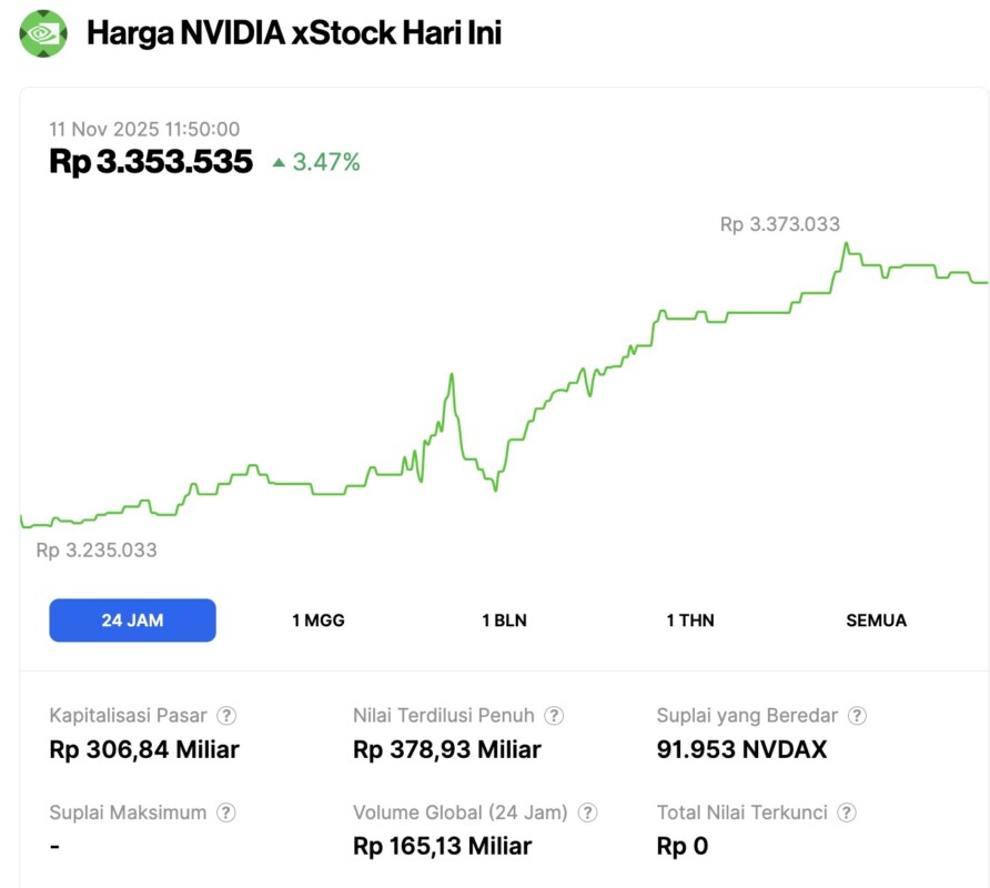 Dilansir dari Pintu Market, harga saham NVIDIA tertokenisasi dari xStock tengah mengalami kenaikan 3,47%, dan di perdagangkan di sekitar $199.88 atau Rp3.353.535 dalam waktu 24 jam. Berdasarkan chart yang ada, NVDAX sempat menyentuh titik terendahnya di Rp3.235.033 dan titik tertingginya di Rp3.373.033.