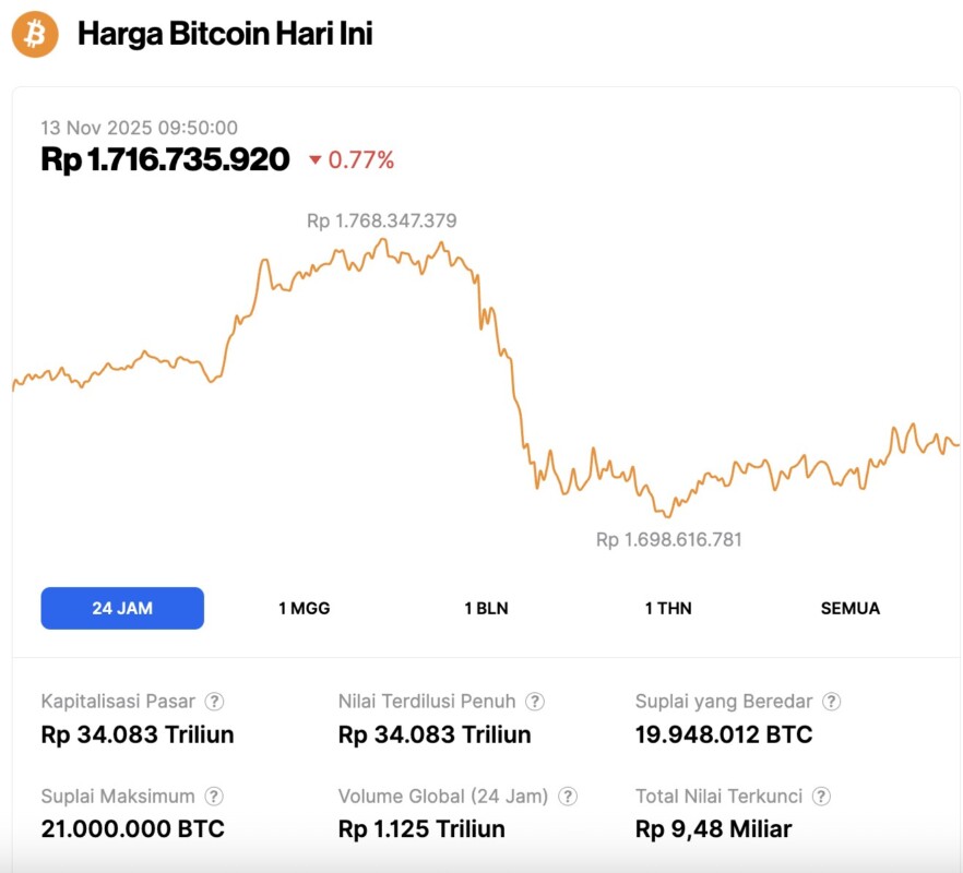 Pada 13 November 2025, harga Bitcoin tercatat berada di level $102,096 atau setara dengan Rp1.716.735.920, mengalami koreksi 0,77% dalam 24 jam terakhir. Sepanjang periode ini, BTC menyentuh level terendahnya di Rp1.698.616.781 dan harga tertingginya di Rp1.768.347.379.
