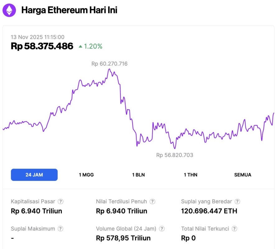 Pada 13 November 2025, harga Ethereum tercatat berada di sekitar $3,459 atau setara dengan Rp58.375.486 mengalami kenaikan 1,20% dalam 24 jam terakhir. Sepanjang periode ini, ETH sempat menyentuh level terendahnya di Rp56.820.703, dan level tertingginya di Rp60.270.716.
