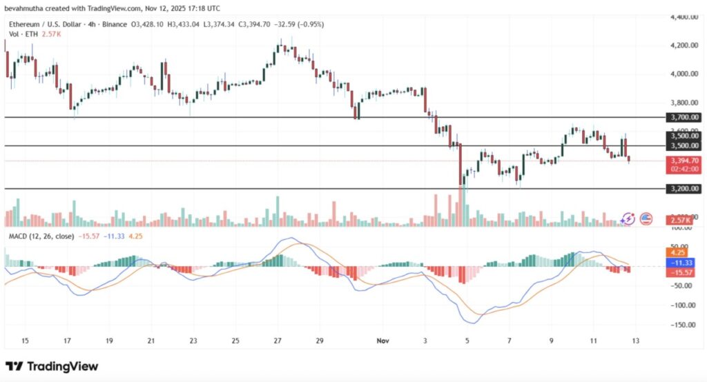 Per 12 November 2025, harga Ethereum sempat diperdagangkan pada $3.397, mencatatkan penurunan sebesar 0,86% dalam 24 jam. Saat ini, ETH bergerak di sekitar $3.400, dengan dukungan signifikan di $3.450 dan resistansi di sekitar $3.600. Proyeksi masa depan Ethereum tetap bullish.