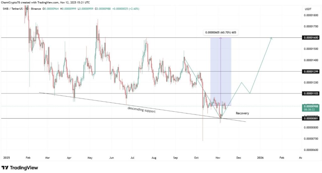 Pada saat penulisan, harga SHIB diperdagangkan pada $0.00000988, menandakan pemulihan yang konsisten dari titik terendah pada Oktober yang sekitar $0.0000088. Harga ini memantul tajam dari garis support yang menurun, membentuk pola potensi pembalikan bullish.