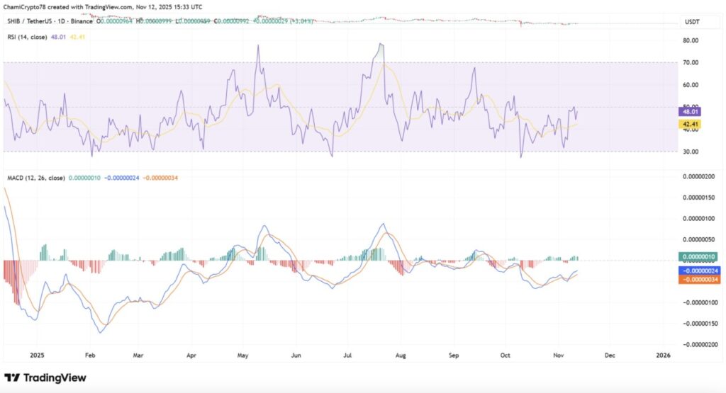 Bacaan RSI dan MACD mendukung peningkatan kekuatan dalam pergerakan harga SHIB. RSI telah naik ke 48, perlahan pulih dari area oversold dan mendekati wilayah keseimbangan. Ini menunjukkan kembalinya pembeli secara stabil, mengurangi dominasi penjualan sebelumnya di grafik.