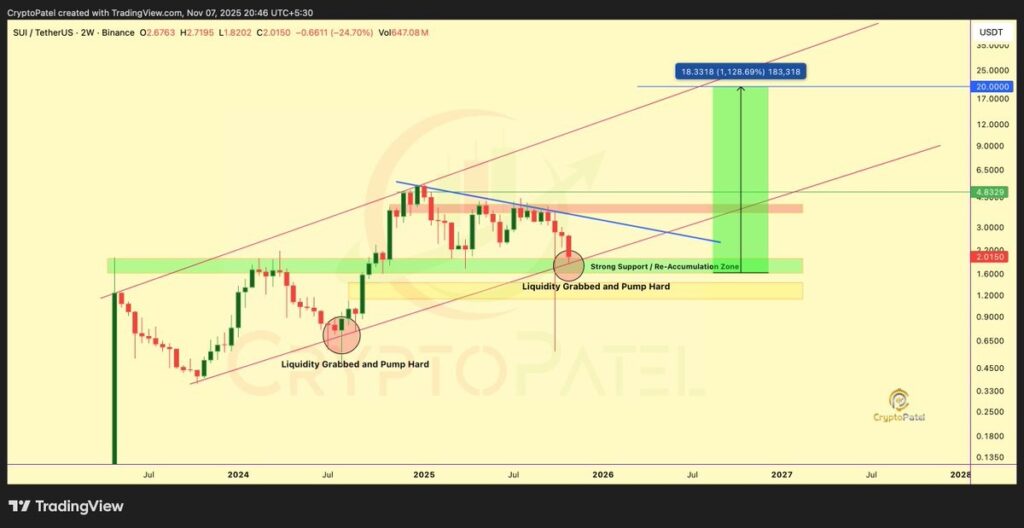 Harga SUI yang saat ini berada di sekitar $2,09 sangat sesuai dengan struktur dasar yang dihighlight oleh analis tersebut. Prediksi tersebut menggambarkan tren breakout yang mungkin berkembang dalam periode yang lebih panjang. Jika terkonfirmasi, hal ini dapat mengangkat harga ke level $20.