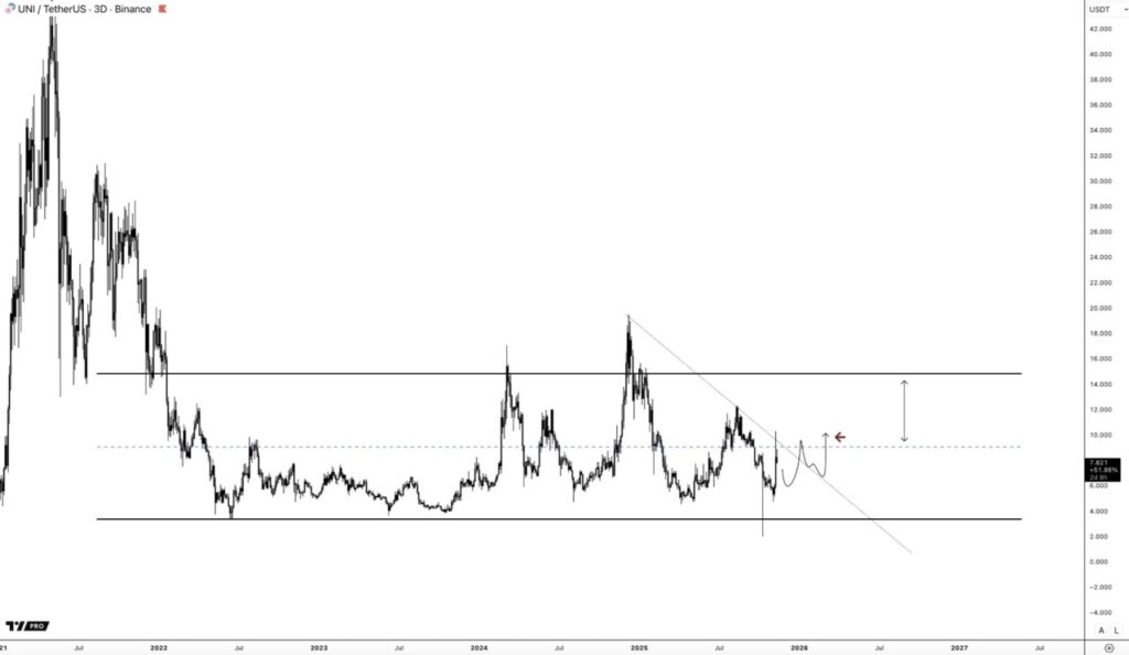 Untuk $UNI, ia akan mencari posisi baik di titik rendah rentang harga, atau setelah terjadi breakout di atas tengah rentang harga dan trendline. Jika kita berhasil reclaim level tengah rentang, targetnya adalah menuju ke level tinggi rentang harga.