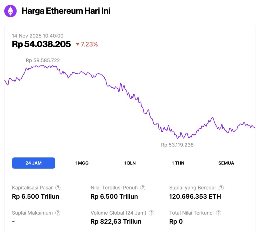 Pada 14 November 2025, harga Ethereum tercatat berada di sekitar $3,217 atau setara dengan Rp54.038.205 mengalami penurunan 7,23% dalam 24 jam terakhir. Sepanjang periode ini, ETH sempat menyentuh level terendahnya di Rp53.119.238, dan level tertingginya di Rp59.585.722.
