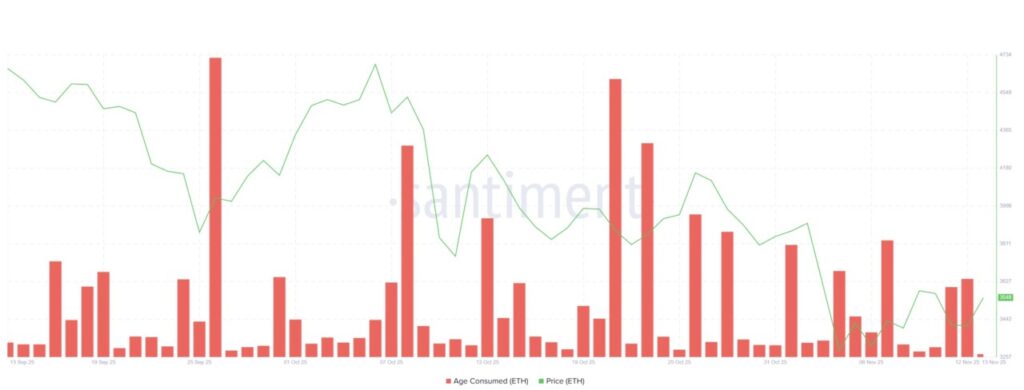 Selain aktivitas akumulasi whale, momentum makro Ethereum juga menunjukkan perbaikan tambahan. Metrik Age Consumed menurun, mencerminkan perlambatan yang jelas dalam penjualan oleh pemegang jangka panjang.