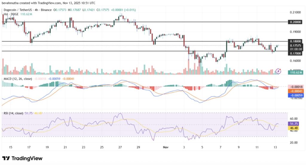 Harga Dogecoin terbaru naik ke $0,1754 pada 13 November 2025, mencatat peningkatan kecil sebesar 2%.