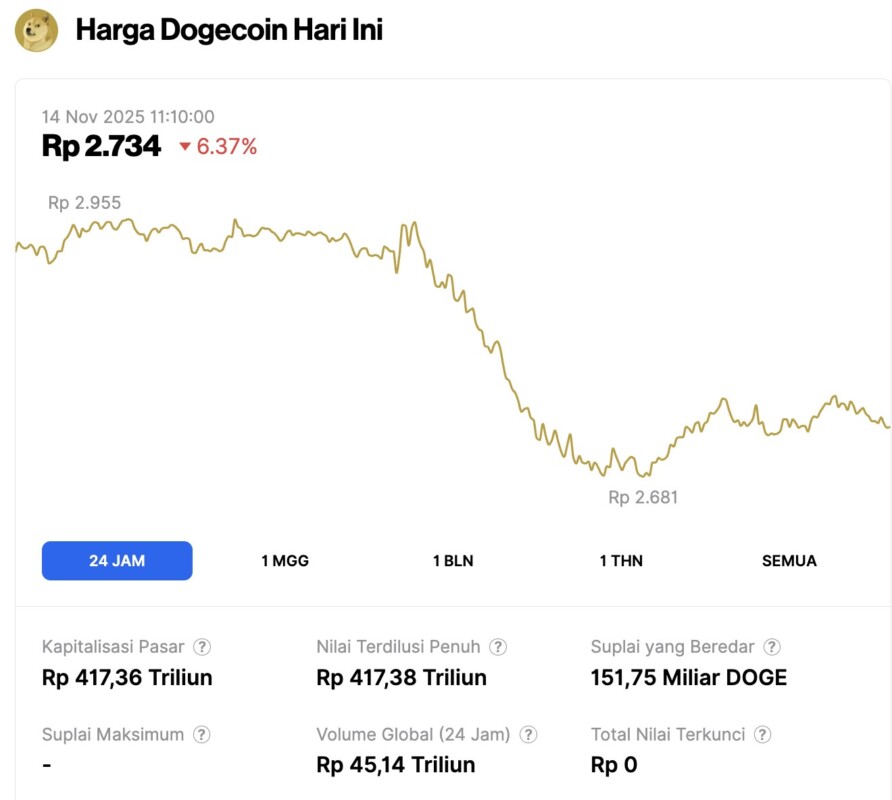 Pada 14 November 2025, harga Dogecoin tercatat mengalami penurunan 6,37% dalam waktu 24 jam, diperdagangkan pada harga $0.1634 atau setara dengan Rp2.734. Dalam periode 24 jam terakhir, harga DOGE bergerak dalam kisaran Rp2.955 hingga Rp2.681.