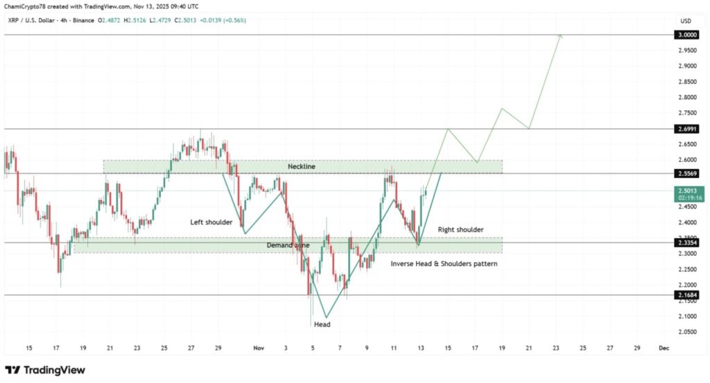 Bahu kanan kini mulai naik secara rapi dari level reaksi sebelumnya dengan struktur yang ketat. Saat ini, nilai XRP berada di kisaran $2,50 setelah pergerakan intraday yang stabil. Harga kini mendekati garis leher (neckline) di sekitar $2,55 dengan tekanan beli yang konsisten.