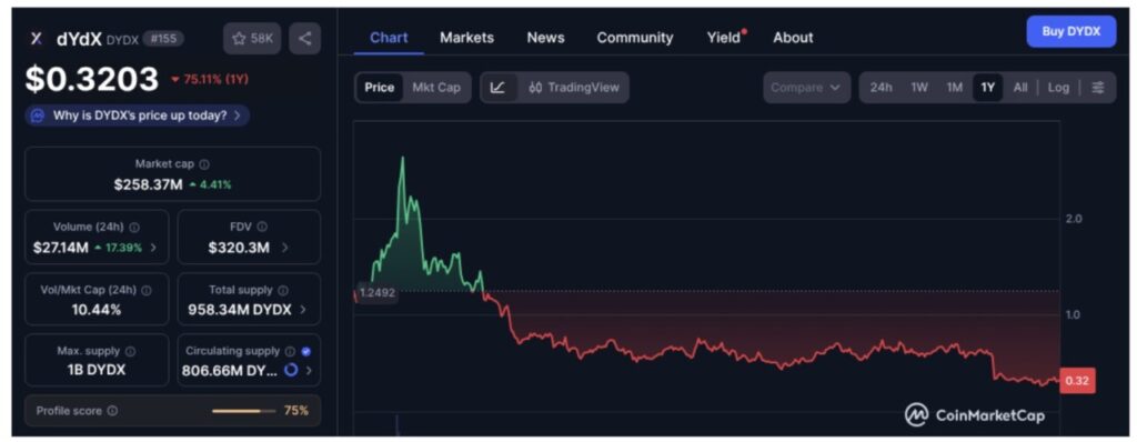 Per 14 November 2025, harga DYDX tercatat sebesar $0,32āturun 75% dibandingkan tahun sebelumnya, namun mengalami kenaikan 4% dalam 24 jam terakhir menurut data dari CoinMarketCap.