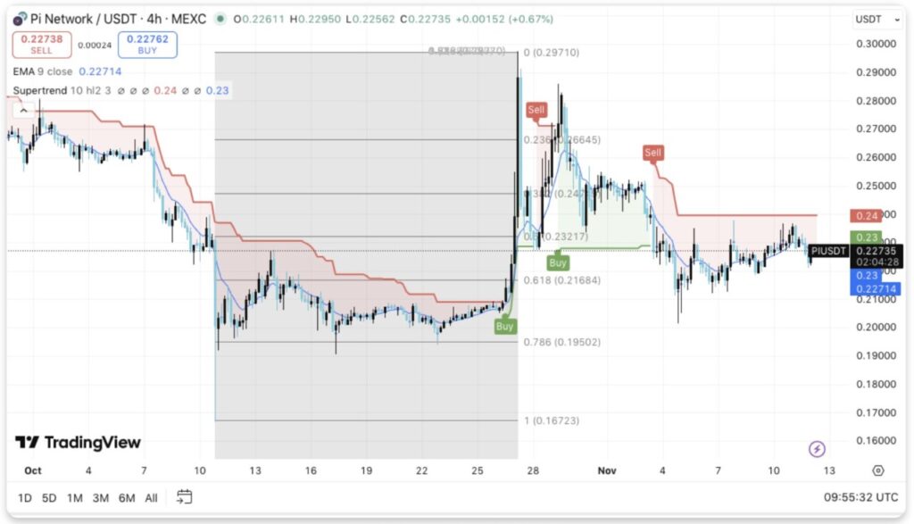 Setelah memantul dari support Fibonacci di $0,216, Pi sempat naik ke $0,297 sebelum mengalami penurunan. Koreksi terbaru menemukan titik tumpu di $0,232, yang sejajar dengan level Fibonacci 38,2%. Area ini kini menjadi zona pertahanan utama bagi para pembeli, dengan momentum jangka pendek yang stabil di atas EMA 9 periode di sekitar $0,227.
