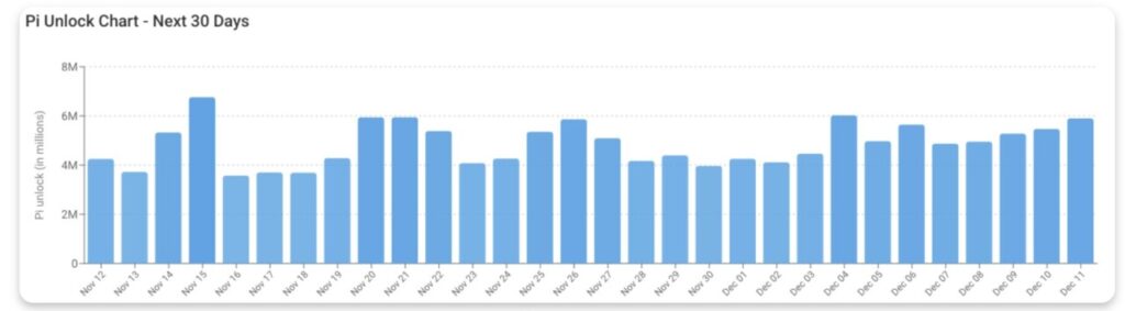 Rata-rata pembukaan harian mencapai sekitar 4,85 juta PI, setara dengan $1,1 juta dalam potensi pasokan baru. Pembukaan terbesar yang diperkirakan akan terjadi pada 15 November, dengan total sekitar $1,54 juta dalam token.