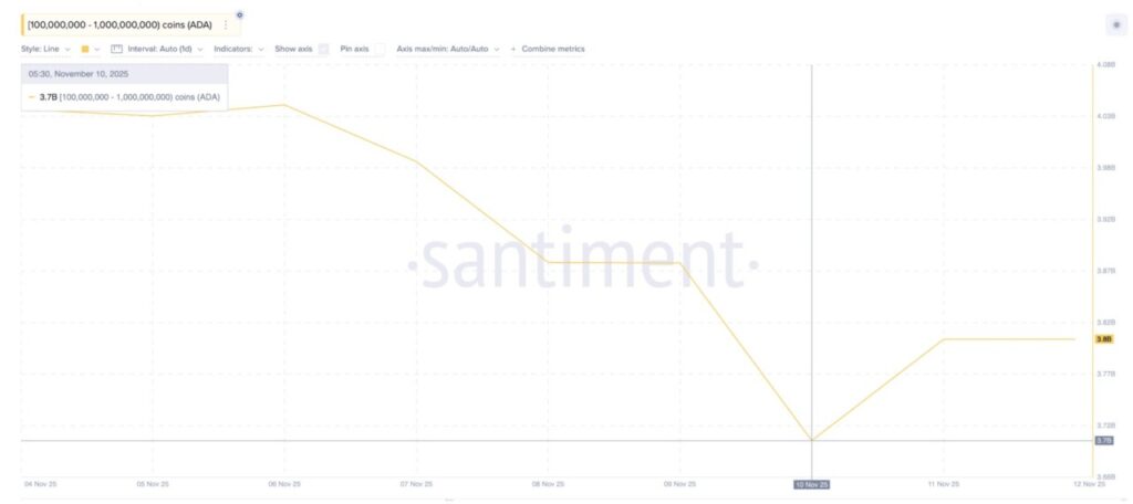 Pemegang besar ADA yang memiliki antara 100 juta hingga 1 miliar token telah meningkatkan saldo mereka dari 3,7 miliar ADA menjadi 3,8 miliar ADA sejak 10 November. Ini berarti sekitar 100 juta ADA ditambahkan hanya dalam dua hari, yang bernilai sekitar $57 juta pada harga saat ini.