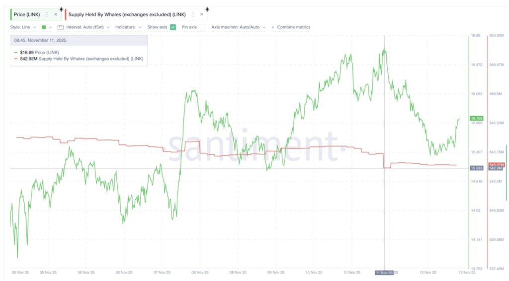 Whale kembali membeli Chainlink setelah beberapa minggu penjualan yang stabil. Dalam 24 jam (12/11), kepemilikan whale meningkat dari 542,92 juta LINK menjadi 543,07 juta LINK, sekitar 150.000 LINK, yang bernilai sekitar $2,36 juta pada harga saat ini.