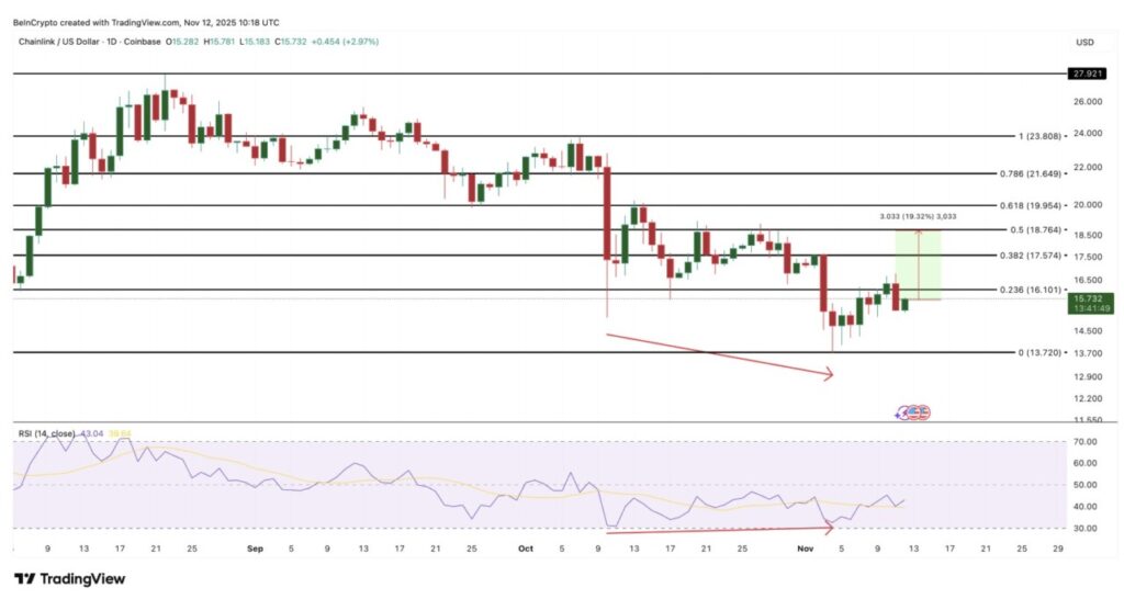 Di sisi teknikal, harga LINK mencatatkan posisi terendah yang lebih rendah antara 10 Oktober dan 4 November, sementara Relative Strength Index (RSI) — yang mengukur kekuatan beli dan jual — mencatatkan posisi terendah yang lebih tinggi.
