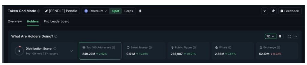 Dompet whale yang memegang antara 100.000 dan 1 juta PENDLE meningkatkan saldo mereka sebesar 7,64%, mencapai 2,86 juta token. Sementara itu, 100 alamat teratas (mega paus) meningkatkan kepemilikan mereka sebesar 2,62%, kini mencapai 249,27 juta token — tambahan sekitar 6,37 juta PENDLE, senilai hampir $17,7 juta.