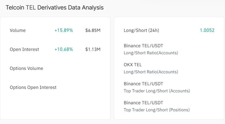 Pasca pengumuman charter, terjadi lonjakan signifikan dalam volume dan minat terbuka di pasar Derivatif Telcoin. Rasio Long/Short menunjukkan posisi long yang lebih agresif, mengindikasikan ekspektasi pasar terhadap kenaikan harga TEL yang berkelanjutan.