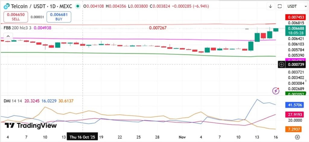 Jika Telcoin (TEL) berhasil menembus band atas Fibonacci Bollinger Bands, harga berpotensi menuju $0,008; namun jika gagal, harga dapat terkoreksi ke dukungan di sekitar $0,0047, sesuai dengan indikator pergerakan arah dan pola volume saat ini.