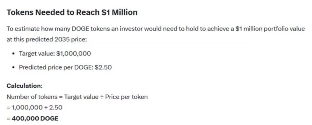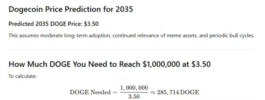 Untuk menghitung berapa banyak token Dogecoin yang perlu dimiliki agar mencapai nilai $1 juta pada tahun 2035, digunakan proyeksi dari beberapa sumber berbasis AI, termasuk ChatGPT, Grok dari xAI, dan platform prediksi Telegaon.