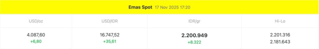 Pada pukul 17:20 WIB, harga spot emas internasional tercatat di $4.087,60 per ons troi, mengalami kenaikan sebesar $6,80 dari hari sebelumnya. Dengan nilai tukar USD/IDR sebesar Rp16.747,52, maka harga emas dalam rupiah berada di Rp2.200.949 per gram, naik Rp8.322 dibandingkan hari sebelumnya. Rentang harga harian (Hi-Lo) berkisar antara Rp2.181.643 hingga Rp2.201.316, mengindikasikan volatilitas pasar yang cukup aktif sepanjang hari.