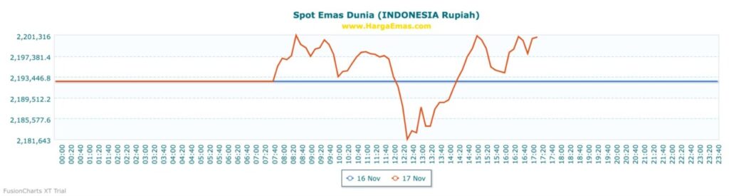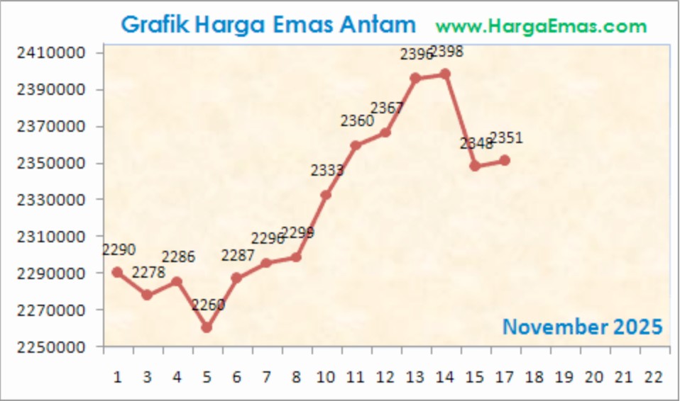 Harga sempat menyentuh titik terendah di Rp2.260.000 pada 5 November, lalu naik signifikan hingga mencapai Rp2.398.000 pada 13–14 November. Setelah itu, harga terkoreksi dan berada di kisaran Rp2.351.000 pada 17 November.
