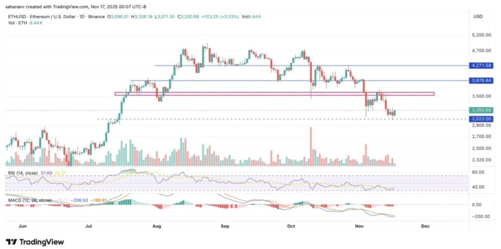 Per 17 November, ETH sempat diperdagangkan di kisaran $3.150–$3.200 dan tetap berada di atas zona permintaan utama yang sebelumnya menjadi titik pantulan selama bulan September dan awal November. Namun, secara teknikal, ETH masih menunjukkan pola lower highs dan lower lows, mengindikasikan kelemahan dari sisi pembeli.