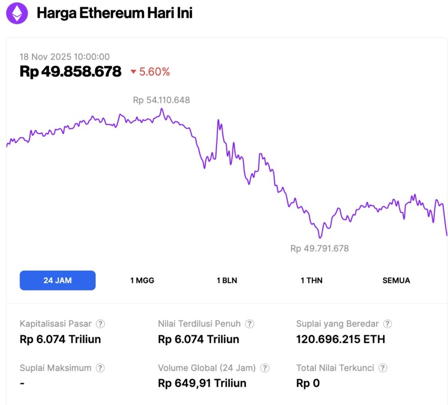 Pada 18 November 2025, harga Ethereum tercatat berada di sekitar $2,968 atau setara dengan Rp49.858.678 mengalami penurunan 5,60% dalam 24 jam terakhir. Sepanjang periode ini, ETH sempat menyentuh level terendahnya di Rp49.780.675 dan level tertingginya di Rp54.110.648.