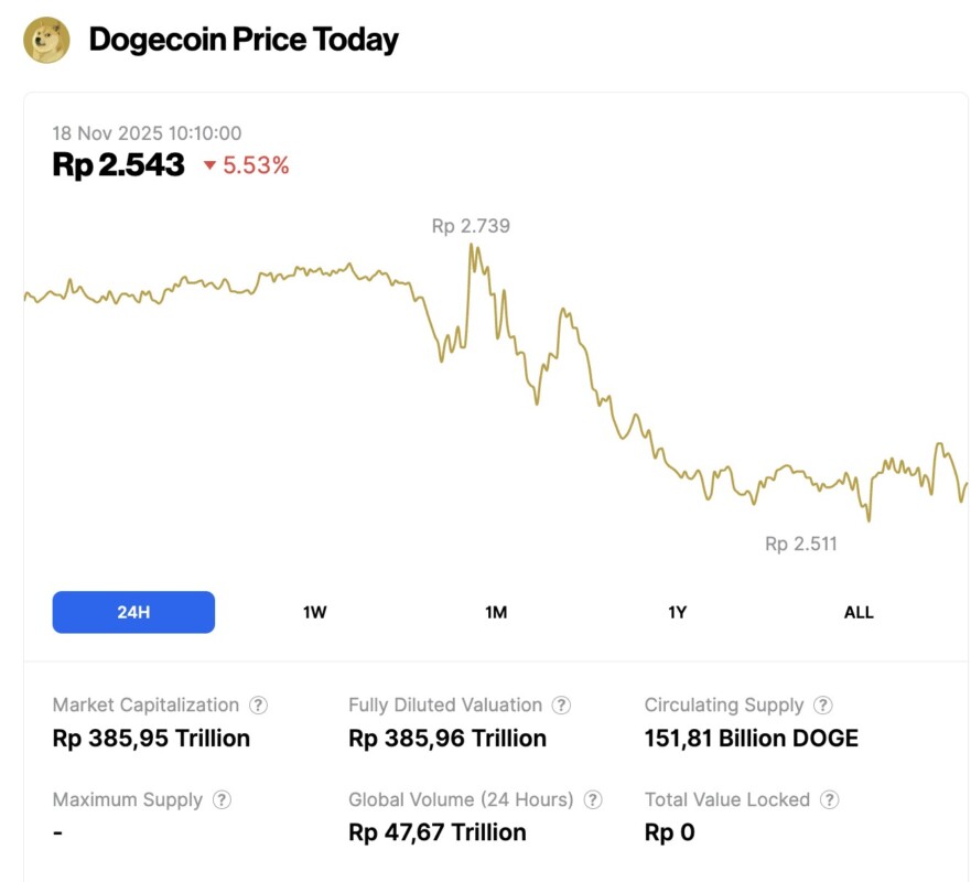 Pada 18 November 2025, harga Dogecoin tercatat mengalami penurunan 5,53% dalam waktu 24 jam, diperdagangkan pada harga $0.1513 atau setara dengan Rp2.543. Dalam periode 24 jam terakhir, harga DOGE bergerak dalam kisaran Rp2.739 hingga Rp2.511.