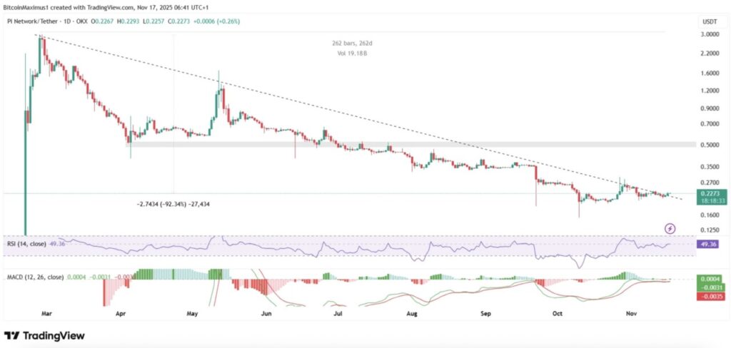 Analisis harga harian (17/11) menunjukkan bahwa Pi Network akhirnya berhasil menembus resistensi diagonal yang telah bertahan sejak harga tertinggi sepanjang masa. Penurunan PI sebelumnya mencapai titik terendah di $0,153 pada 10 Oktober, namun tren kemudian mulai berbalik arah.