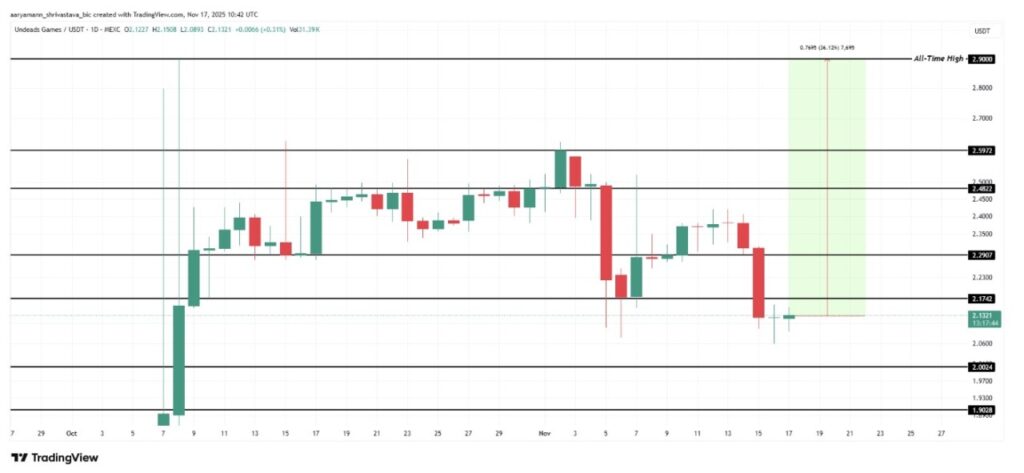 Pada 17 November, UDS diperdagangkan di harga $2,13 dan masih tertahan di bawah level resistensi $2,17. Token ini berada sekitar 36% di bawah harga tertinggi sepanjang masanya di $2,90, yang menunjukkan masih adanya ruang untuk reli jika pembeli kembali mengambil alih kendali dan mendorong momentum ke arah bullish.