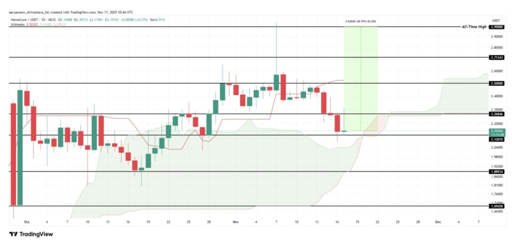 Memecore (M) diperdagangkan di harga $2,15 dan masih bertahan di atas level support $2,12 per 17 November. Token ini berada sekitar 39% di bawah rekor tertingginya di $2,99, menandakan perlunya partisipasi investor yang lebih kuat untuk mendorong momentum dan mendukung pemulihan yang berkelanjutan.