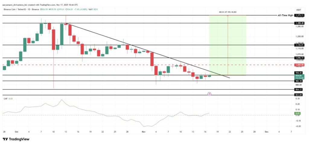 Arus dana masuk ke BNB mulai meningkat, ditandai dengan indikator Chaikin Money Flow yang menembus di atas garis nol. Perubahan ini mengindikasikan tumbuhnya kepercayaan investor, yang bisa mendorong BNB untuk menembus resistensi di $1.000.