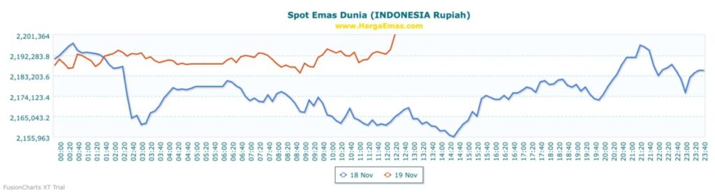 Melalui grafik spot emas dalam rupiah, harga emas pada 19 November (garis merah) mengalami tren naik dibandingkan hari sebelumnya (garis biru). Titik tertinggi dicapai sekitar pukul 12:00 siang dengan angka mendekati Rp2.201.364.