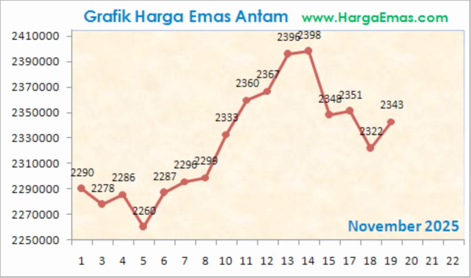 Grafik bulanan emas Antam menunjukkan pergerakan yang cukup dinamis. Harga sempat mencapai puncak di Rp2.398.000 pada 13–14 November, sebelum turun ke Rp2.322.000 pada 18 November.