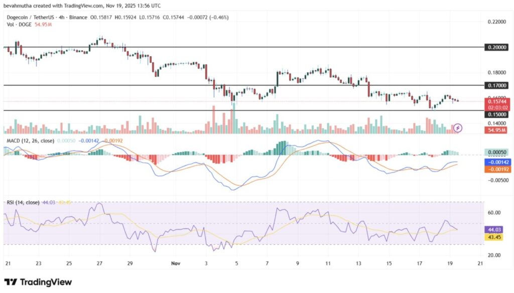 Saat laporan ini dibuat (19/11), harga Dogecoin (DOGE) berada di sekitar $0,158. Indikator MACD menunjukkan adanya persilangan bullish kecil, menandakan perubahan momentum yang mulai berpihak kepada pembeli.