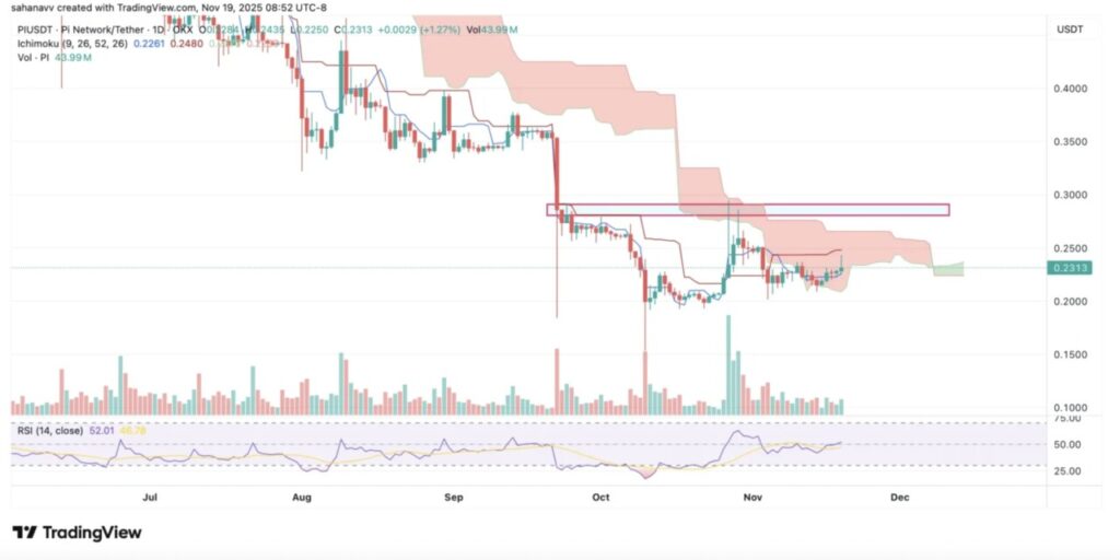 Resistance penting: $0,28 — jika PI berhasil menembus level ini, bisa terjadi percepatan tren naik. Support terdekat: $0,217 — jika harga jatuh di bawah level ini, tren naik jangka pendek bisa melemah.