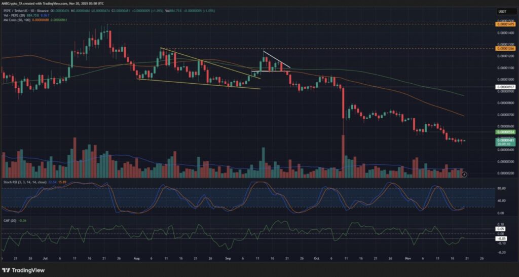 Pada grafik harian (1-day chart), PEPE menunjukkan tren yang masih sangat bearish (turun). Struktur pasar di timeframe ini sudah bearish sejak akhir September, saat PEPE membentuk titik lower high baru di bawah level $0.00000937.