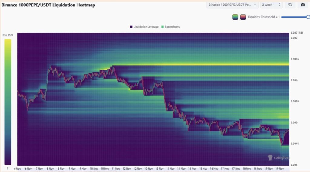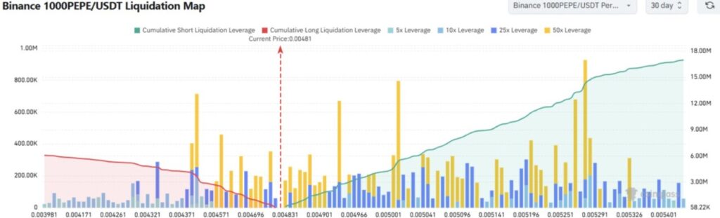 Peta panas likuidasi (liquidation heatmap) menunjukkan bahwa area harga $0.000005 hingga $0.0000055 penuh dengan potensi likuidasi posisi short. Ini menjadikannya sebagai target paling mungkin untuk terjadinya pantulan harga.