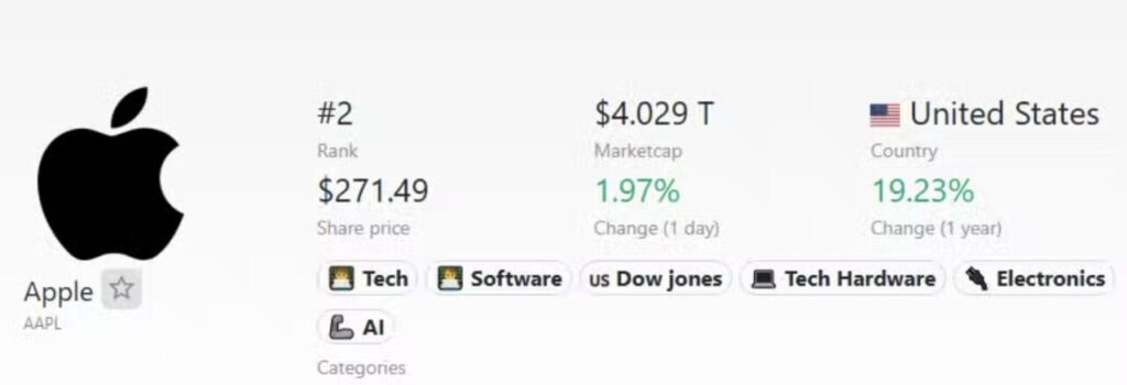 Sebagai perbandingan, Apple saat ini adalah salah satu perusahaan paling bernilai di dunia, dengan kapitalisasi pasar sekitar $4,029 triliun, menjadikannya perusahaan nomor dua secara global dalam hal valuasi.