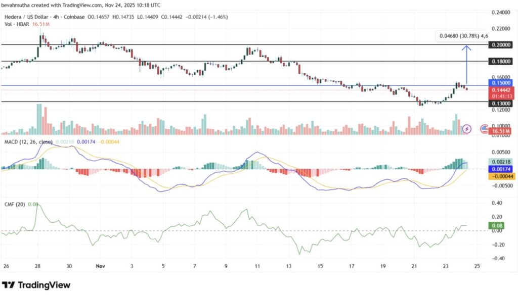 Jakarta, Pintu News – Harga Hedera (HBAR) melonjak lebih dari 10% pada 24 November, menarik minat kuat dari para pelaku pasar yang optimis (bullish). Saat ini, harga cryptocurrency tersebut berada di atas $0,1450, menunjukkan adanya breakout setelah terbentuknya beberapa pola pembalikan tren naik.