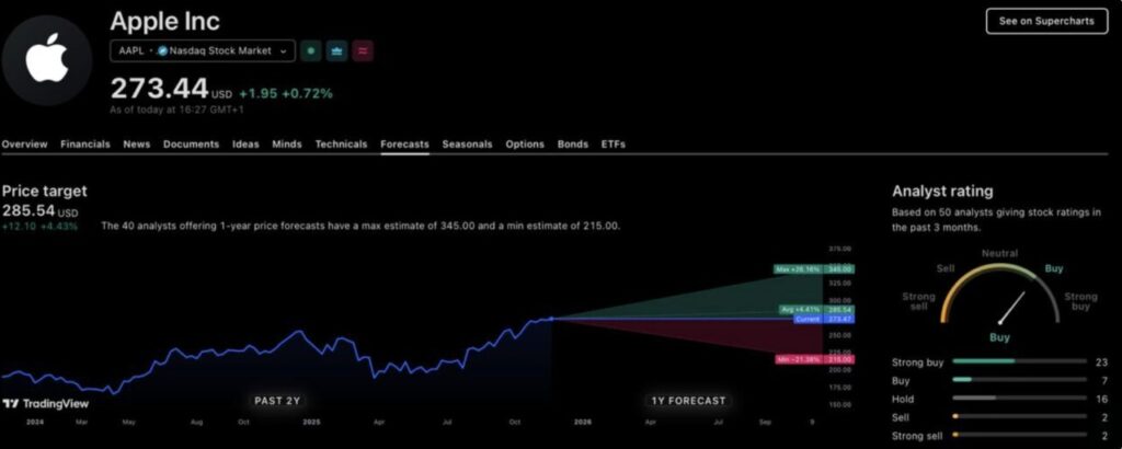 Menurut konsensus analis selama 12 bulan dari TradingView, harga saham Apple diperkirakan mencapai $285,54, yang mengindikasikan potensi kenaikan moderat dibandingkan level harga saat ini.
