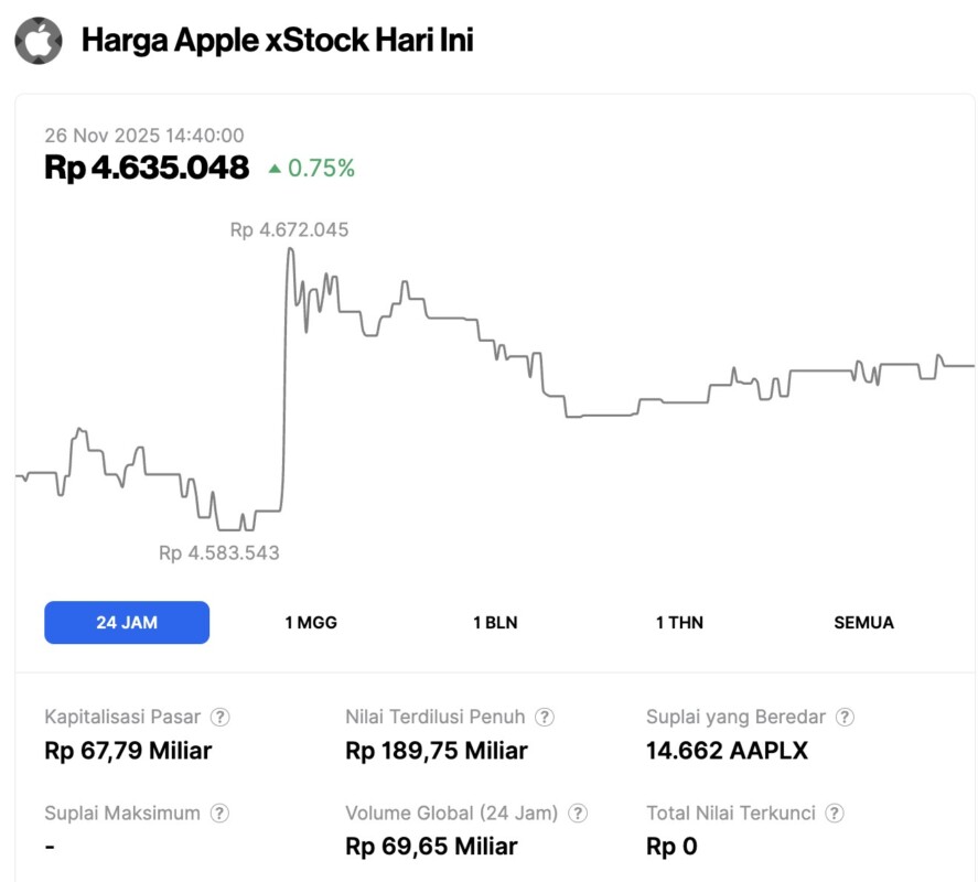 Dilansir dari Pintu Market, harga saham Apple tertokenisasi dari xStock tengah mengalami kenaikan tipis 0,75%, dan di perdagangkan di sekitar Rp4.635.048 dalam waktu 24 jam. Berdasarkan chart yang ada, AAPLX sempat menyentuh titik terendahnya di Rp4.583.543 dan titik tertingginya di Rp4.672.045.