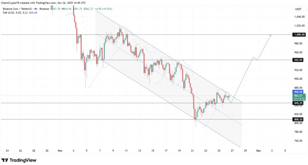 Struktur grafik menunjukkan pola yang semakin jelas, di mana BNB membentuk pola yang lebih sempit di dekat bagian atas kisaran harganya. Saat ini, nilai Binance diperdagangkan di sekitar $859,92, tetap berada di atas zona reaksi penting $845 yang menjadi acuan utama pada grafik.